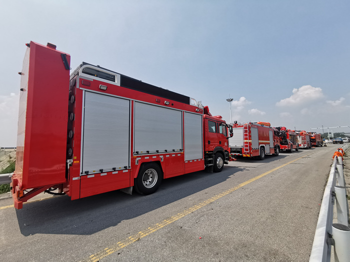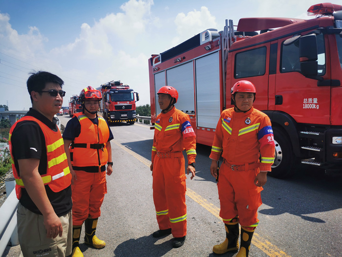 高遠圣工應急救援消防車,配合江蘇消防支隊的遠程供水車在荷寶高速鳳泉口、新中大道前辛莊路口進行清障、警戒、抽水任務。